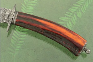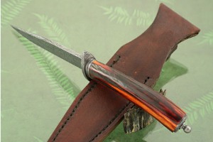 The polished amber stag handle provides a sure comfortable grip, with just the right amount of downturn. Damascus fittings match the blade.