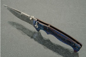 The titanium damascus frame is contoured and carved. The anodized surface shows off the dramatic pattern created by forging together different grades of titanium. Polished titanium posts keep the handle light and fast. The titanium pocket clip is mounted for tip up, right handed carry. Dual titanium thumb studs make for easy right or left handed opening -- though you'll likely open the knife using the flipper mechanism. The blade is unlocked with a right handed button lock. A thong hole set at the back of the scales allows for the easy addition of a lanyard.