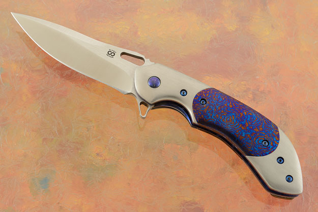 The handle combines anodized titanium damascus with satin finished titanium. The combination is both visually dramatic and keeps the knife light and strong. Anodized titanium liners are hand fileworked and anodized to a deep purple/blue tone. They are jewel polished on the interior. The titanium damascus pocket clip is mounted for right handed, tip-up carry. The titanium backbar is marked WC270 on the interior. Bolsters, pocket clip and back spacer are also titanium.