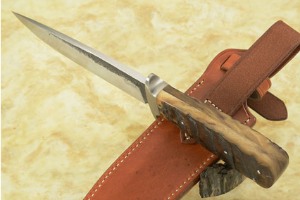 The handle is comprised of two pieces of expertly matched ram's horn. Mortised tang construction ensures strength and durability. Ram's horn is a natural material preferred by many knifemakers for its natural texture and organic appearance. Stainless steel pins set the handle in place and are carved to match the natural shape of the horn. The 416 stainless steel guard is satin finished and helps bring weight to the center of the knife.