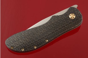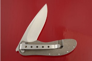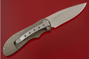 The handle combines a titanium lock side with a lightning strike carbon fiber side. This combination ensures strength and a light weight. Lightning strike carbon fiber was originally designed for use on fighter jets to redirect lightning. It is among the hardest to find knifemaking materials. The titanium side features a stone washed finish. The handle is completed with a deep-carry titanium pocket clip, mounted for right-handed, tip-up carry.
