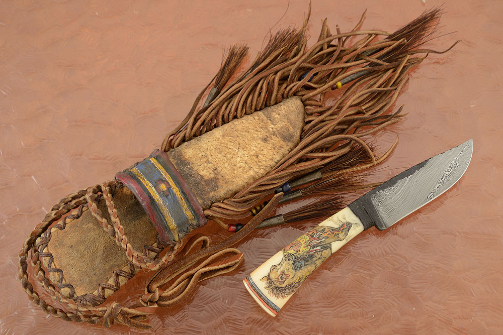 The handle is formed from ancient walrus ivory. The ivory was scrimshawed by renowned artist Linda Karst-Stone. A detailed Native American war horse is depicted on the maker's side.