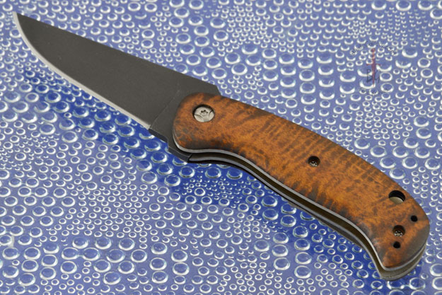 The scales are formed from dyed curly maple set on titanium liners for strength and durability. Barrel spacers keep the knife incredibly light while providing the strength needed. A lanyard can be added easily if desired. The titanium pocket clip can be mounted for right or left-handed, tip-up carry.