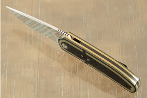Like Andre's knives the blade of this flipper is perfectly centered and has some of the smoothest action you'll ever feel. It is easily opened with one hand using the discreet and ambidextrous flipper toggle. It uses the IKBS (Ikoma Korth Bearing System) pivot system. This mechanism, which was originally designed to fit balisong knives, uses ball bearings to create exceptional action with no blade play.