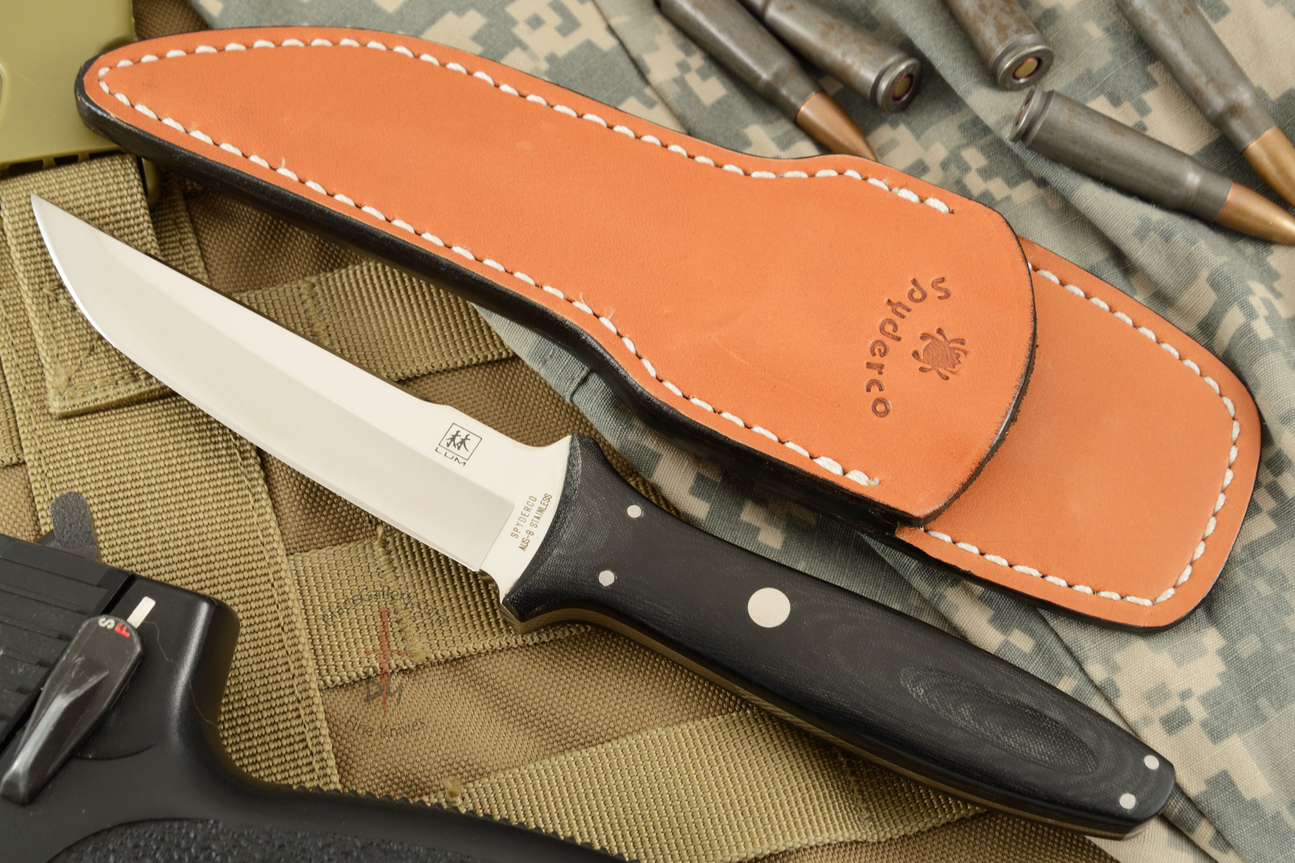 The Spyderco Lum Tanto Fixed blade (FB03) has a Hamaguri (appleseed) grind at the tip for added strength and the swedge on the spine to lessen the overall weight. The AUS-8 stainless steel blade is hollow ground and satin finished.