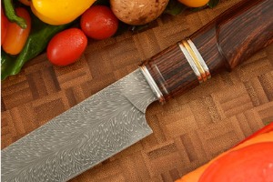 Product Description for Feather Pattern Damascus Chef's Knife (Hakata Santoku) -- 6-1/2 in. -- with Desert Ironwood and Saya