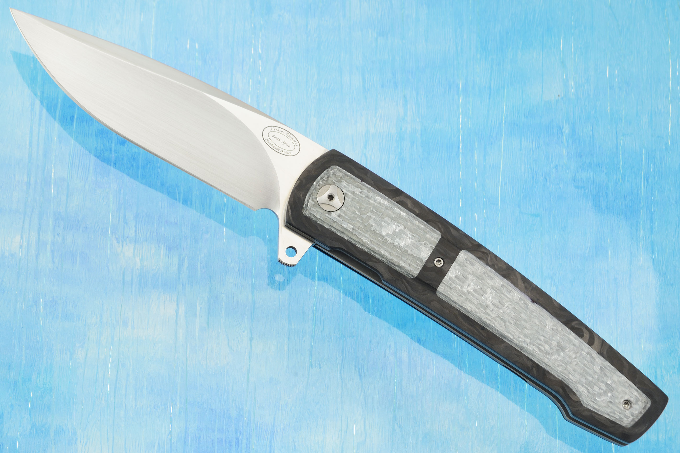 3D contoured handle scales are formed from shred carbon fiber and inlaid with sections of silver twill. The combination is absolutely beautiful! Titanium liners keep the knife light and strong. The knife is easy to keep close at hand using the machined titanium pocket clip which is mounted for right-handed, tip-up carry. A ceramic bearing makes this a particularly effective pocket clip.