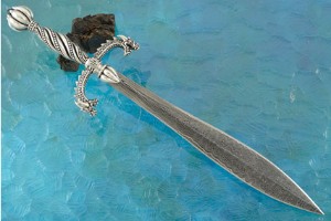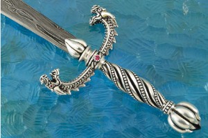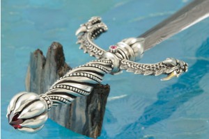 Painstakingly sculpted from solid sterling silver, the handle features an abundance of amazingly detailed carving and engraving. Garri used 87.7 grams of sterling silver to create the handle. Each of the quillions is completed with a highly detailed dragon's head. The eyes of the dragons are inlaid with faceted 1.6mm rubies. At the center of the quillions is Garri's carved maker's mark and the reverse side is inlaid with a faceted 3mm ruby. The pommel represents a dragon's claw clenching a 8.8mm faceted garnet. All jewels used are natural gemstones and are meticulously faceted.