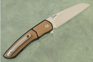 The scales combine black and coyote brown G-10 in a finely fitted inlay. The black G-10 scales were then carved so the brown G-10 is raised slightly above the surface surrounding it. The results are exceptional! The handle is completed with blue anodized titanium liners and a machined titanium pocket clip with ceramic retention ball.