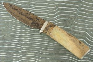 Blade: Heat colored Bird's Eye pattern damascus forged from O1 and L6 carbon steels along with nickel
