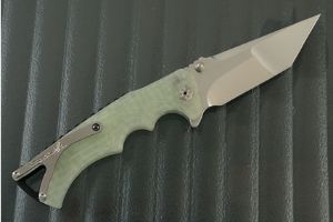 Jade TurboGlow scales are precision 3D machined for a sure, comfortable grip. The composite handle glows in the dark!! The scales surround a black G-10 back spacer. The deep carry titanium pocket clip is mounted for right-side, tip-up carry. Dual titanium thumb studs make for easy right- or left-handed opening -- though you'll likely open the knife using the ambidextrous flipper mechanism. The blade is closed with a right-handed button lock. Piercing at the back of the handle allows for the easy addition of a lanyard.