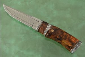 The handle is formed from stabilized maple burl. A damascus bolster, spacer and pommel bring weight into the handle. The handle is nicely contoured for a secure, comfortable grip. This is a knife you won't want to put down.