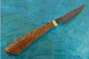The 3-1/4 inch blade was closely forged to shape from Kevin's own damascus. He began with 1084 and 15N20 carbon steels, ensuring a keen, long lasting cutting edge. The blade is ground nicely thin, for precise detail work while caping game. The spine is nicely rounded for a comfortable grip.