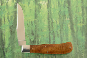 The gently rounded handle is formed from stabilized curly koa set on 410 stainless steel liners (Hrc 42-43). About ten very thin coats of Tru-Oil provide a rich, heirloom quality finish. Red G-10 liners add contrast and assist the knife to adjust to temperature and humidity changes. The backspring is formed from ELMAX. Heat treated to 46-47 Hrc.